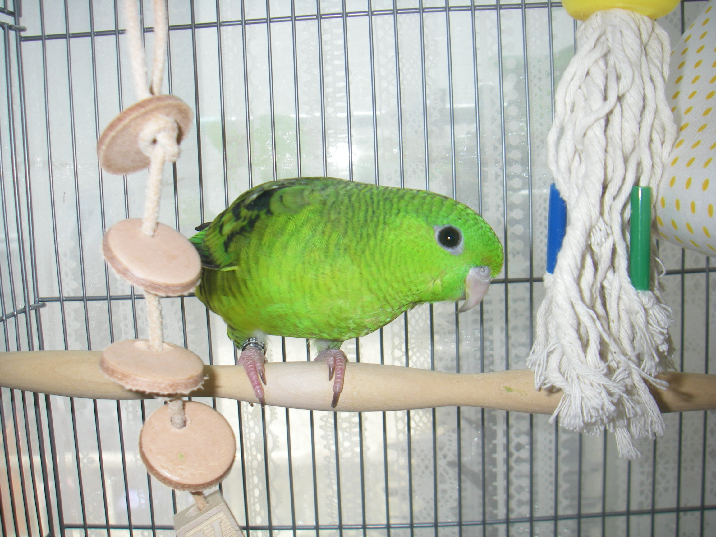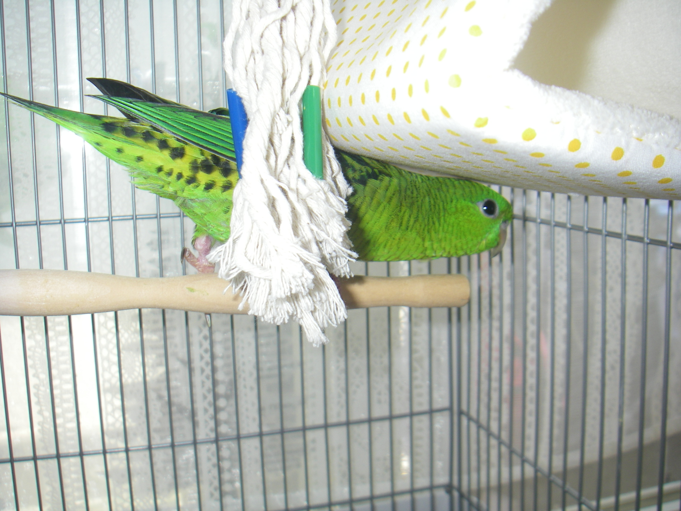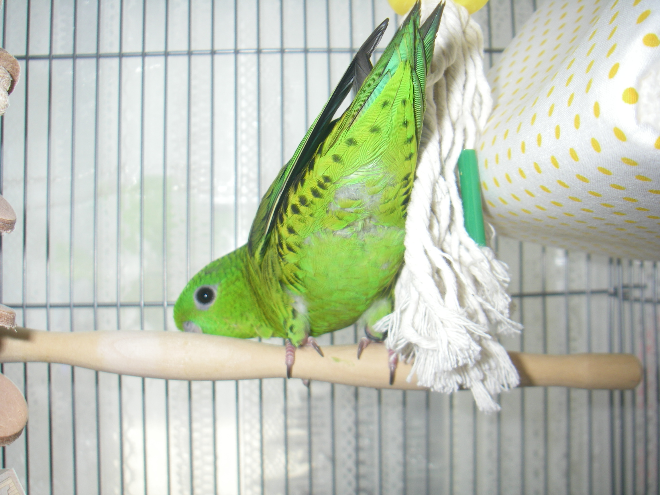 が、3日目の今日は、サザナミインコ特有の水玉のおパンツを見せるまでになりました^^