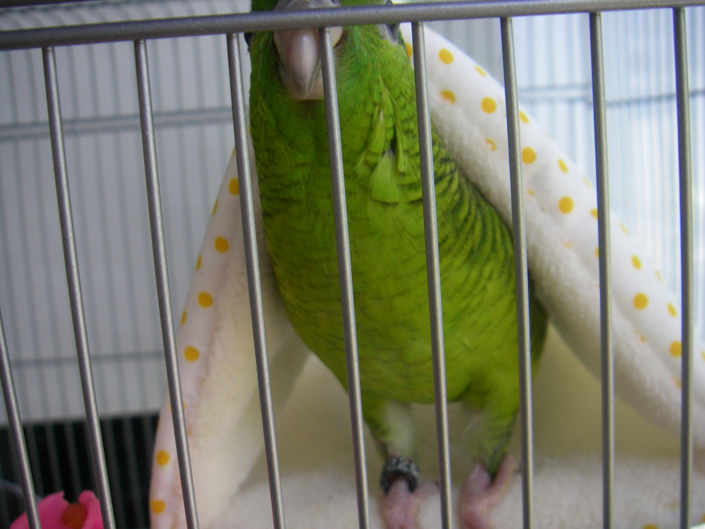 なんだか、とってもビビリなゴーシュ (仕方ないよね・・・だって、挿し餌をしてあげてない私との関係から築かないといけないんじゃね) 昨日は、ちょっとケージから出してみましたけど・・・ 入り口を開けて、しばらくしてから出てきてくれましたが、 飛んだあとの着地が下手で、 ピアノの後ろに二度落ちるという最悪な結果で (ホバリングして、着地場所を吟味するってこと、しないのよね) 猶予無しで、クリッピングしました(風切り羽を4枚)。 大昔に飼ってたセキセイインコのクリッピングを思い出して。 次の生え替わりまでに、家の配置や私やチュンセに慣れようね。 なので、ケージの中に、入れる物をいきなりじゃあなくて、ケージの外に置いて、 お見合いさせています(フッ~ゥ)